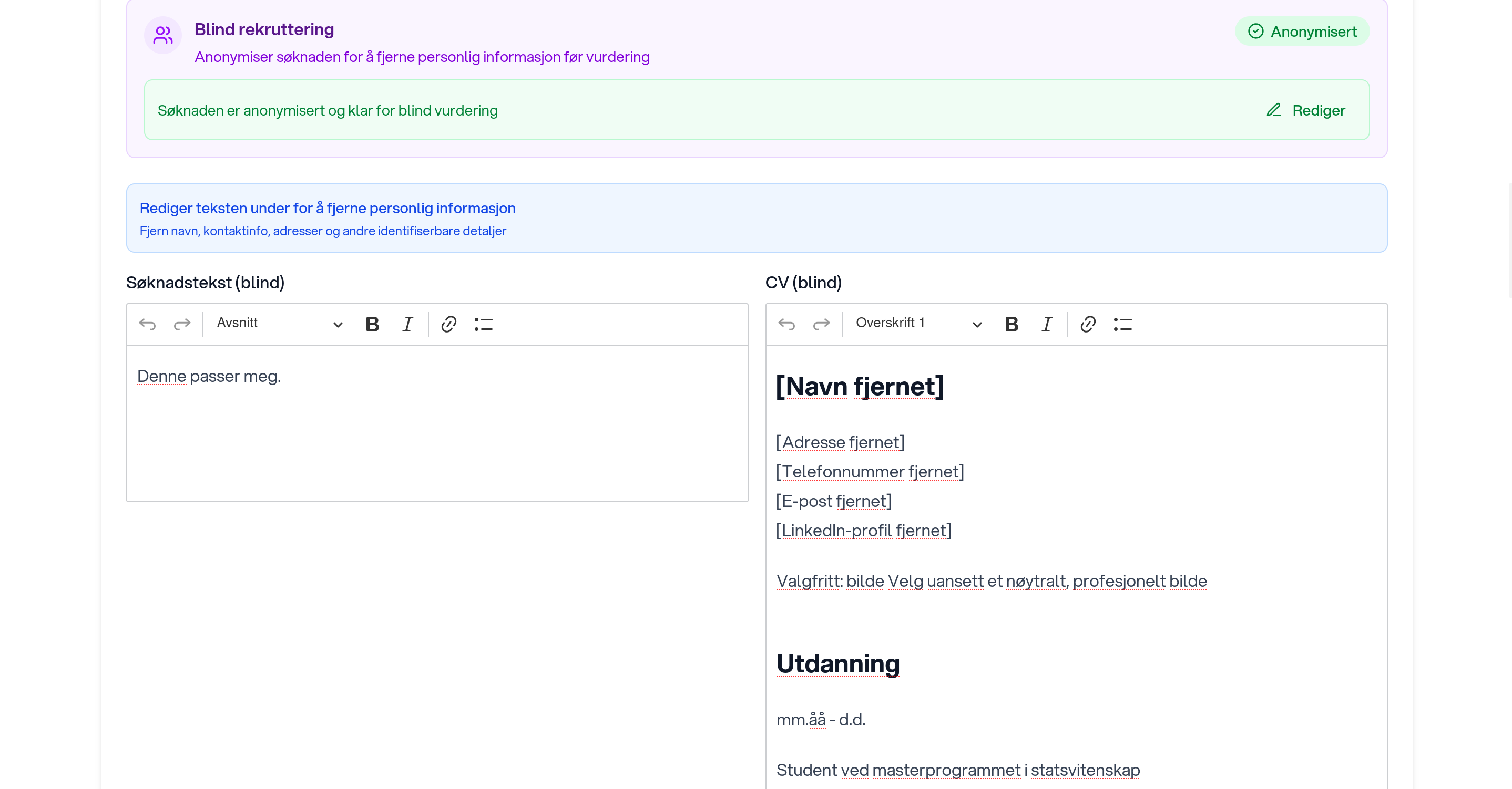 Vi bruker kunstig intelligens for å fjerne personlig informasjon fra søknadstekst og CV. Alle søknader som blir sendt inn på whoo blir annonymisert automatisk ved innsendelse.